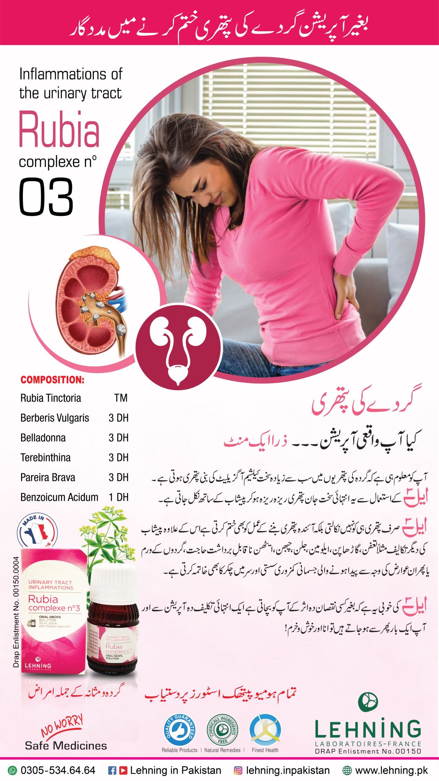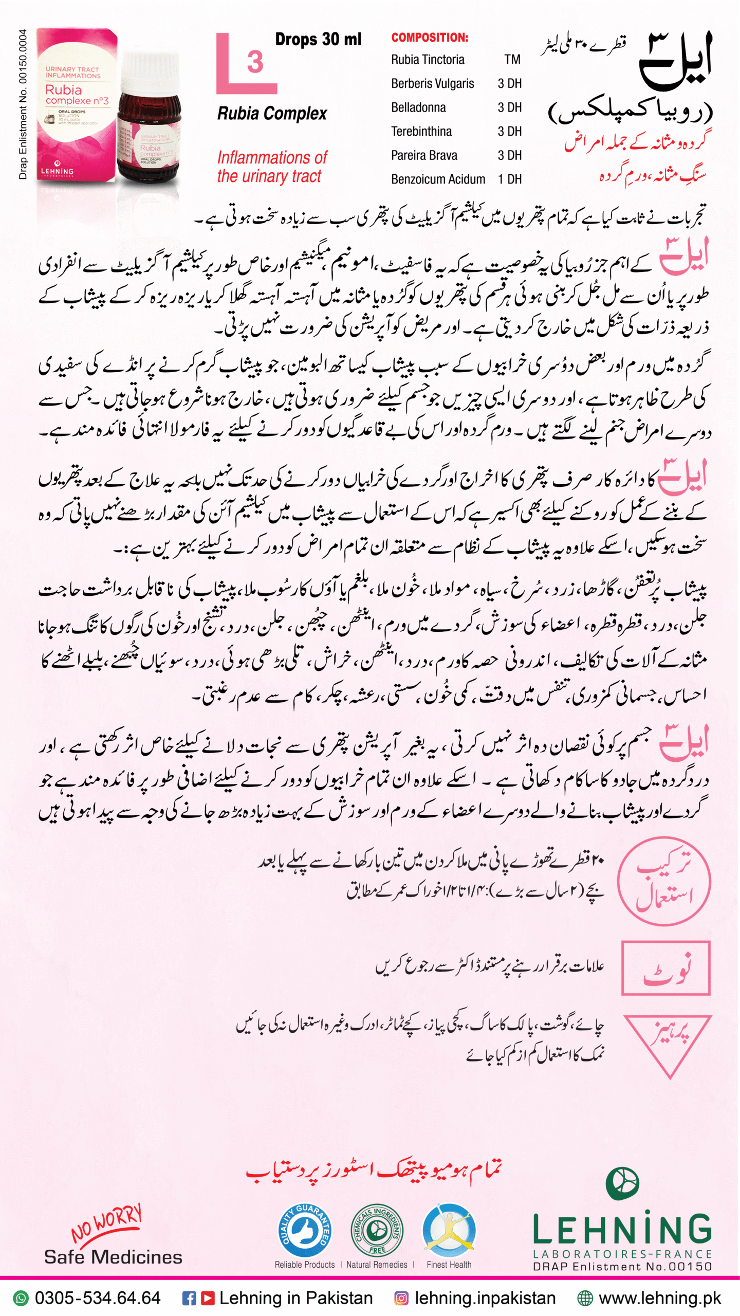 L-3 Rubia Complex is a homeopathic medicine developed by Lehning Laboratories. It is specifically designed for managing urinary tract infections. The composition of this complex includes several natural ingredients such as Rubia Tinctora, Berberis Velgaras, Belladona, Terbinthina, Pareira Brava, and Benzoic Acidum.