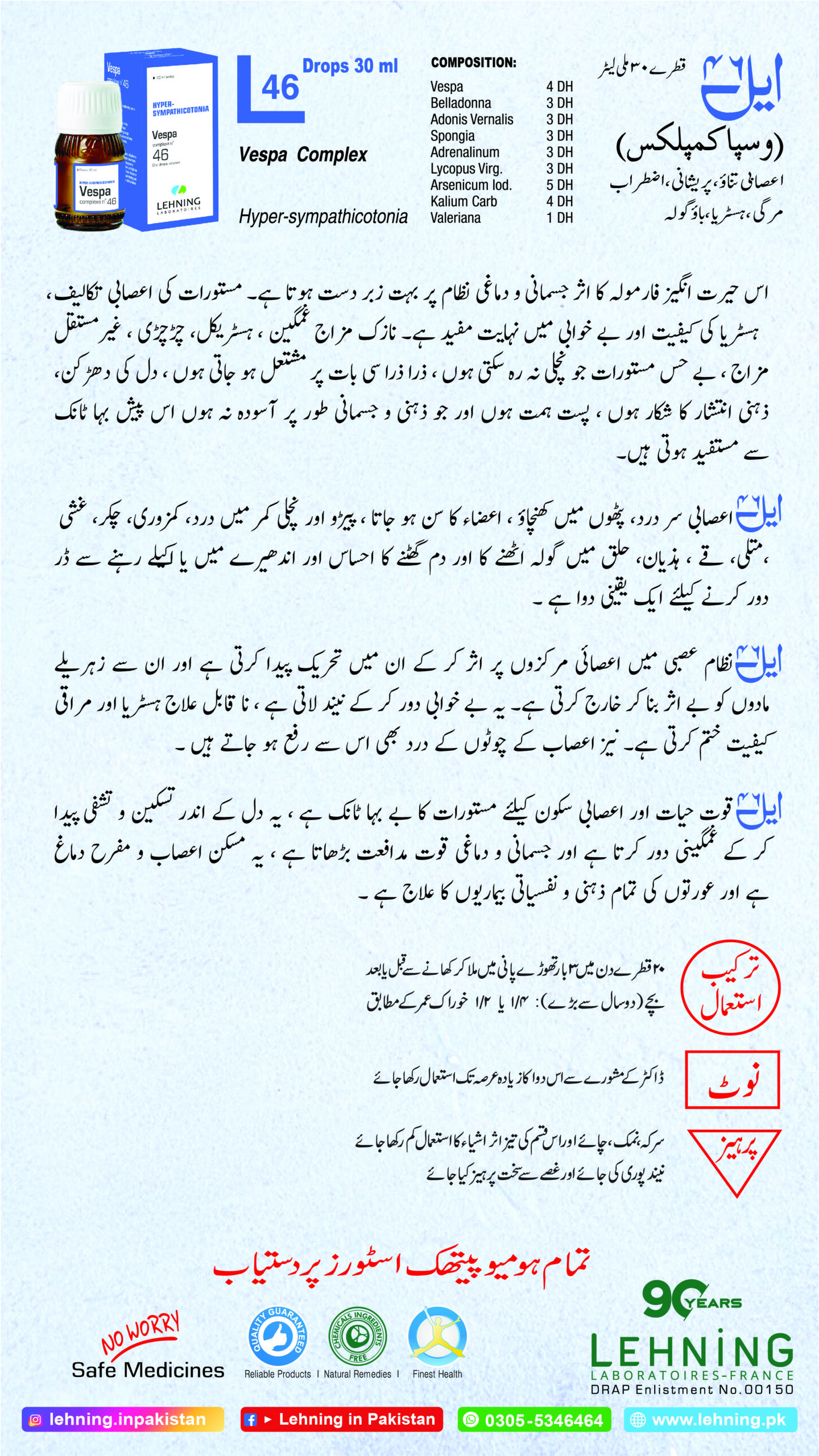 Overall, L-46 Vespa Complex by Lehning Labortries France offers a natural approach to managing Hyper Sympathycotonia symptoms by combining various homeopathic ingredients.
